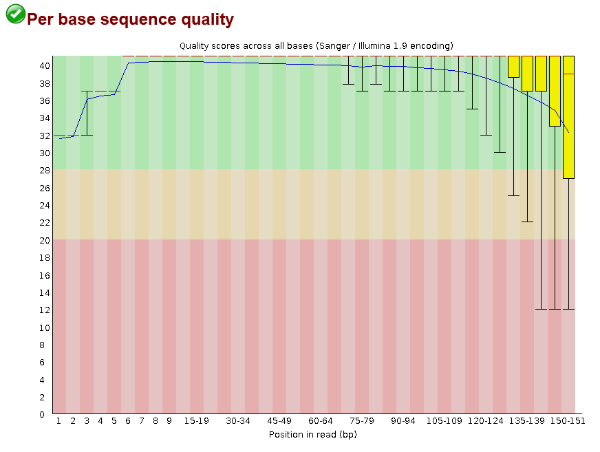 pse-chr2_1.fastq.gz.This tells us we've sequenced 537507 reads that range from 30-151bp long (though the vast majority are 150bp). It also tells us that none of the reads are considered low quality by FastQC. That's good! But let's take a look at the quality score distribution anyway: